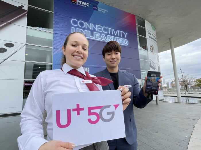 | ▲ MWC 행사가 열리는 피라 바르셀로나에서 행사진행 관계자와 LG유플러스 직원이 U+DIVE 앱을 보여주는 모습 [사진=LG유플러스 제공] |