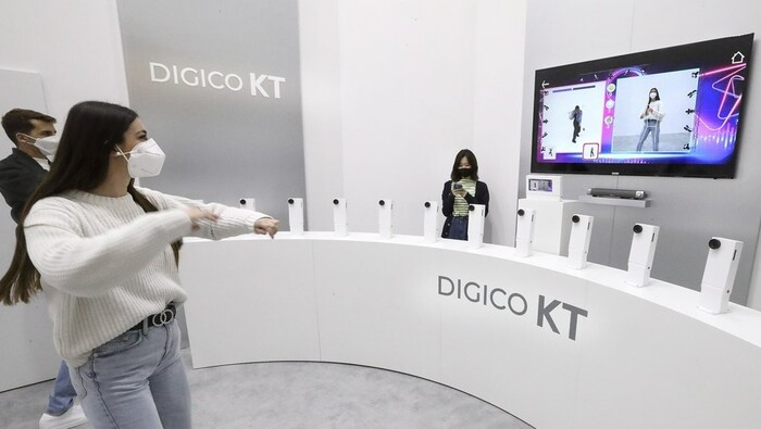 | ▲ MWC 2022 KT 전시관에서 'KT 리얼댄스'를 체험 중인 관람객의 모습 [사진=KT 제공] |