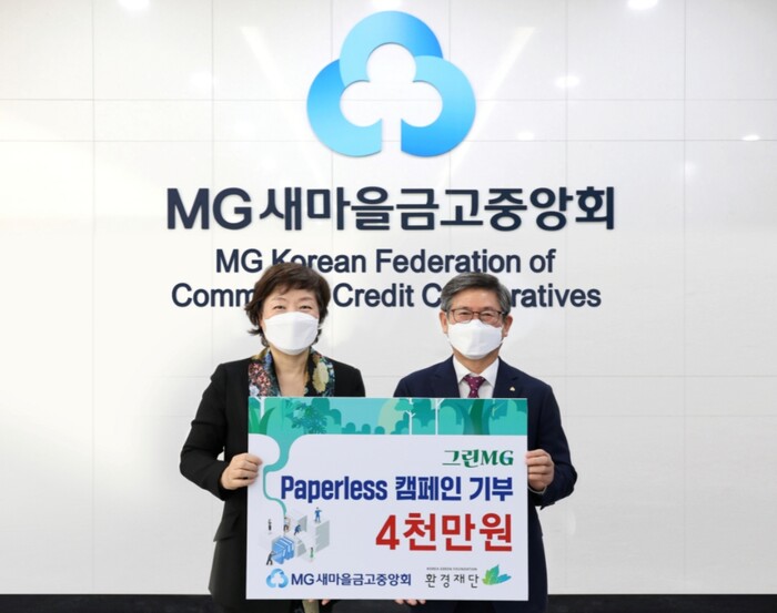 새마을금고중앙회가 '그린MG 페이퍼리스(Paperless) 캠페인'과 더불어 국내 환경 개선 활동을 통한 탄소중립 및 환경보호에 기여하기 위해 기부금 4000만원을 재단법인 환경재단에 기부했다.