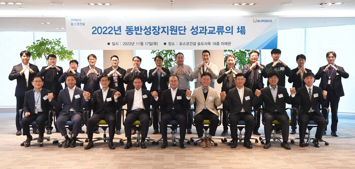 | ▲ 17일 인천 송도사옥에서 포스코건설이 2022년 동반성장지원단 성과교류의 장을 열고 기념촬영을 하고 있다 [사진=포스코건설 제공] |