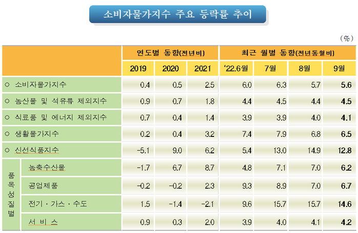 ▲ 2022년 9월 소비자물가 동향. [통계청 제공] |