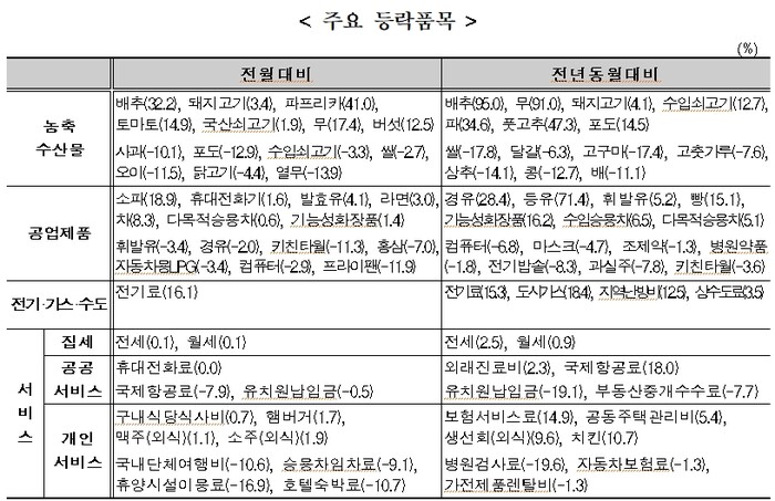 ▲ 주요 등락품목. [통계청 제공] |
