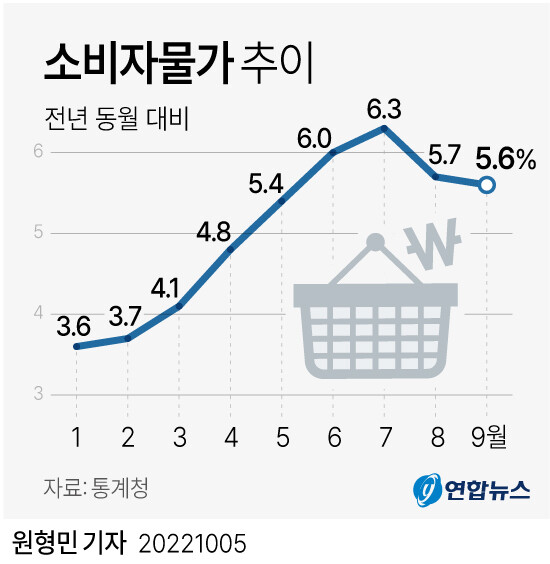 9월 소비자물가가 5% 중반대로 2개월 연속 전년 동월 대비 상승폭은 둔화했지만 여전히 고물가는 이어졌다.