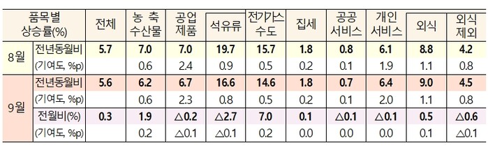 ▲ 8월과 9월 품목별 물가지수와 전체 물가 기여도. [기획재정부 제공] |