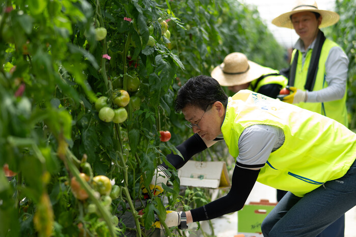 [메가경제=노규호 기자] NH농협은행은 강태영 은행장이 대명종합건설 임직원과 경기 광주시 퇴촌면의 토마토 농가를 찾아 일손돕기를 실시했다고 21일 밝혔다.