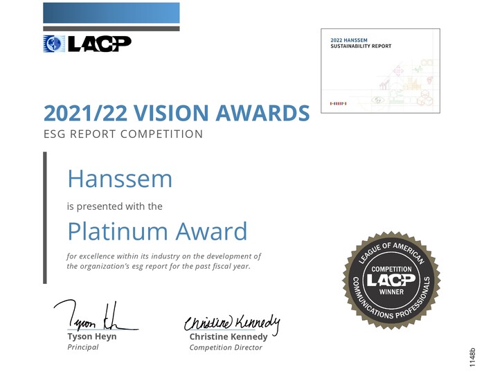 한샘 지속가능경영보고서는 비전 어워드 ESG 레포트 부문 최고 등급인 대상을 수상했다. 첫인상·디자인·창의성·정보전달력 등 8개 평가항목 중 7개 항목에서 만점을 받으며 총점 99점을 획득했다.
