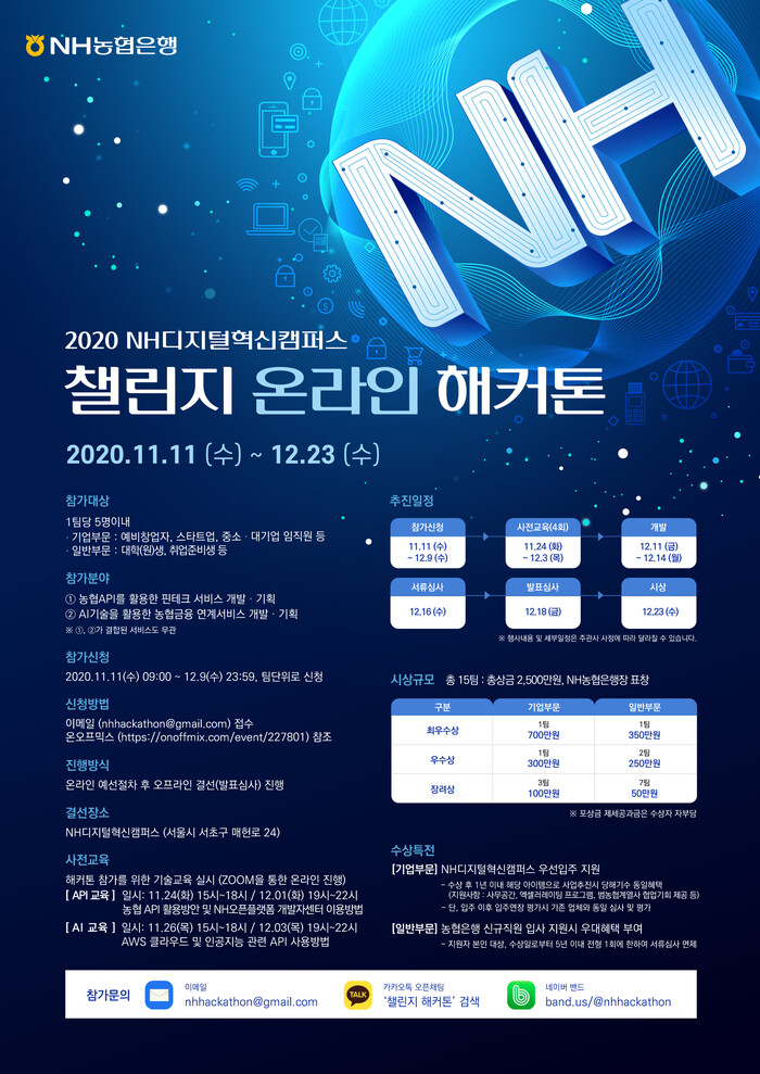 농협은행은 참가자들의 혁신적인 아이디어가 구체적인 결과물로 창출될 수 있도록 농협API와 AWS(아마존웹서비스) 사전 기술 교육을 온라인으로 제공하며, 온라인으로 진행되는 예선 심사를 거쳐 오프라인 결선은 서초구 양재동에 위치한 NH디지털혁신캠퍼스에서 진행한다.