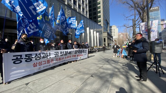 | ▲한국노총 전국금속노동조합연맹 삼성그룹노동조합연대가 지난 2023년 1월 서울 시청역 인근 삼성카드 본사 정문 앞에서 삼성카드고객서비스 초과이익성과급(OPI) 차별 지급 철폐를 촉구하는 기자회견을 하고 있다. [사진=삼성그룹노조연대 제공] |