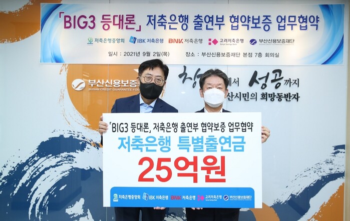 저축은행중앙회(회장 박재식)는 2일 코로나19 등으로 어려움을 겪고 있는 중소상공인의 자금지원을 위해 부산 소재 3개 저축은행(IBK, BNK, 고려)과 부산신용보증재단(이사장 김승모) 간 ’저축은행 출연부 협약보증을 위한 업무협약‘을 체결했다고 밝혔다.