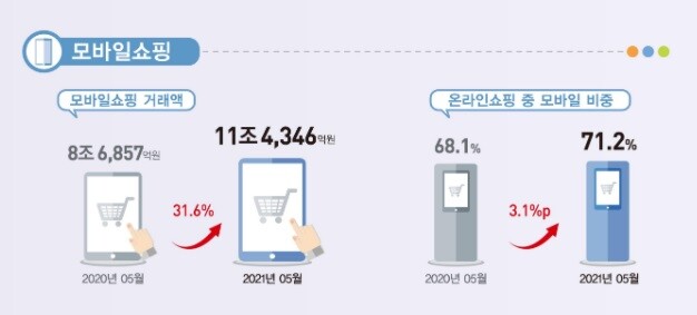 5월 온라인쇼핑 전체 거래량 중 모바일을 통한 쇼핑의 비중은 4분의 3에 육박하는 것으로 나타났다. 모바일쇼핑 거래액은 11조 원을 넘기며 전체 온라인쇼핑 거래액의 70% 이상을 차지한 것이다.