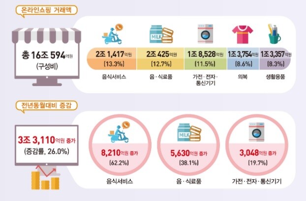 음식서비스 거래액은 1년 전에 비해 62.2%에 달하는 8210억 원이 증가했고 음‧식료품은 38.1% 성장해 5630억 원이 더 거래됐다. 가전‧전자‧통신기기 분야 온라인 거래액은 전년 동월 대비 19.7% 오른 3048억 원이 증가했다.