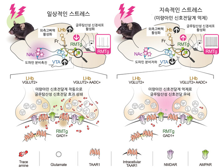 일상적인 스트레스 상황에서는 고삐핵이 미량아민을 분비해 글루탐산성 신경세포 활성화 효과를 상쇄하여 우울 증상을 유발하지 않았지만, 지속적인 스트레스 상황에서는 글루탐산성 신호전달이 미량아민 신호전달보다 우세해 우울 증상을 유발함을 확인했다.