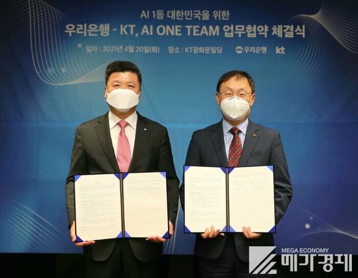 우리금융지주의 자회사 우리은행(은행장 권광석)은 AI기술을 접목한 디지털금융 경쟁력 강화를 위해 KT와 ‘AI 1등 대한민국을 위한 업무협약’을 체결하고, 국내 대표 산학연이 참여 중인‘AI원팀(AI One Team)’에 합류했다고 20일 밝혔다.