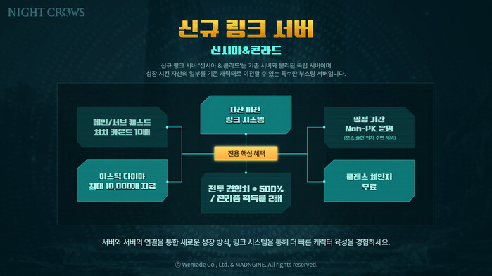 링크 서버 ‘신시아’와 ‘콘라드’는 기존 서버와 자산을 공유할 수 있도록 설계됐다. 이용자는 링크 서버에서 새롭게 육성한 캐릭터의 자산 중 일부를 다른 계정의 기존 서버 캐릭터로 이전할 수 있다. 골드, 아이템, 탈것, 무기 외형, 글라이더 등은 물론, 경험치와 수집 내역, 스킬까지 이전 가능하다.