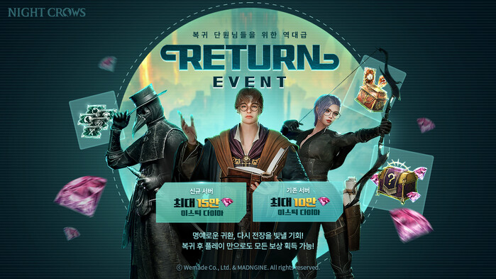 나이트 크로우는 복귀 이용자를 위한 ‘Return(리턴)’ 이벤트를 실시한다. 링크 서버로 복귀 시 최대 15만 개, 기존 서버로 복귀 시 최대 10만 개의 ‘미스틱 다이아’가 지급된다.