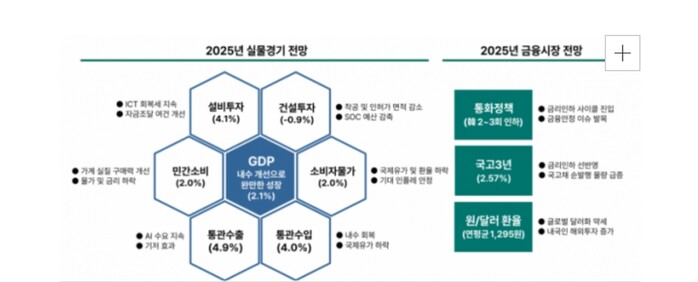 하나은행 하나금융연구소는 16일 2025년 경제 ·금융시장 전망 보고서를 발간하고, 이 같이 전망했다. 완화적인 통화정책 기조가 이어지는 가운데 기준금리는 2~3차례 정도 인하할 것으로도 내다봤다.