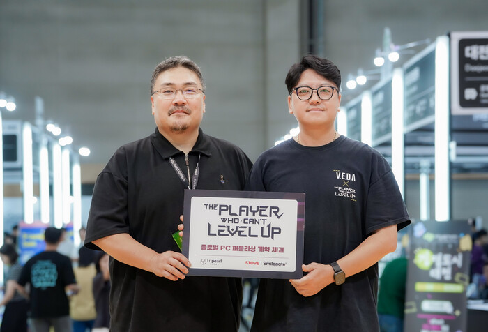 | ▲ 여승환 스마일게이트 여승환 이사(좌)와 정만손 트라이펄게임즈 대표가 기념사진을 촬영하고 있다. [사진=스마일게이트] |