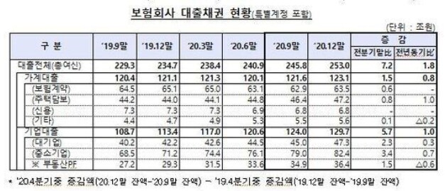 2일 금융감독원이 공개한 '2020년말 기준 보험회사 대출채권 현황'에 따르면 보험회사 총대출채권 규모는 253조원으로 전년말보다 18조3000억원(7.8%) 늘었다.