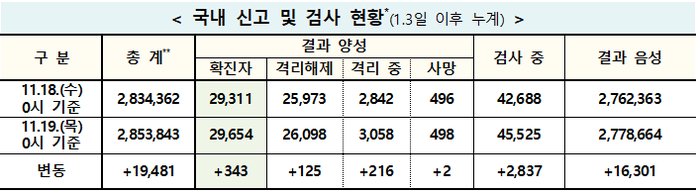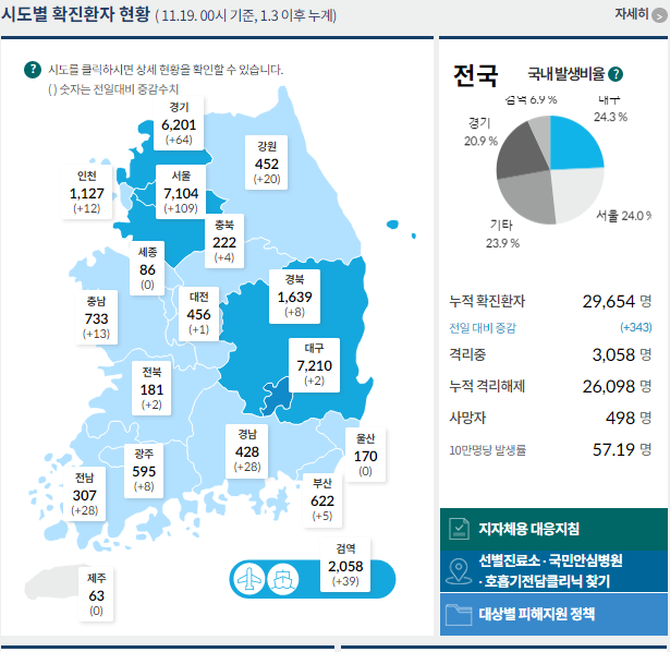 중앙방역대책본부(방대본)는 19일 0시 기준으로 코로나19 신규 확진자가 343명 추가돼 누적 확진자가 2만9654명으로 증가했다고 밝혔다. 현재 증가 추세라면 20일 발표 때는 누적 확진자가 3만명을 돌파할 가능성이 높아졌다.