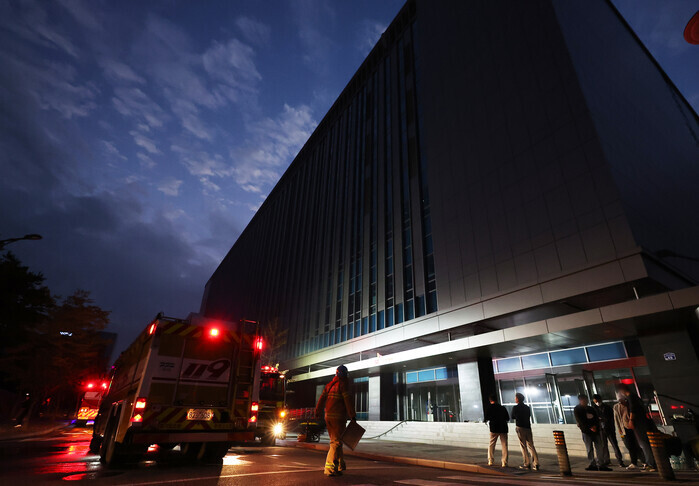 ▲ 15일 오후 화재가 발생한 경기도 성남시 분당구 삼평동 SK 판교 캠퍼스 A동에서 소방관들이 분주하게 움직이고 있다. [사진=연합뉴스] |