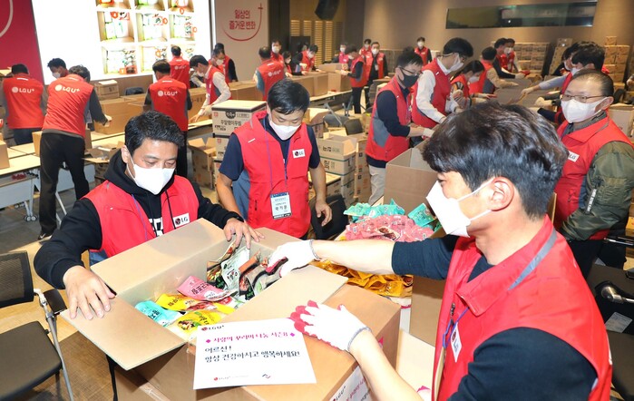 | ▲ LG유플러스 임직원 및 협력사 자원봉사자들이 사랑의 꾸러미를 제작하는 모습 [사진=LG유플러스 제공] |