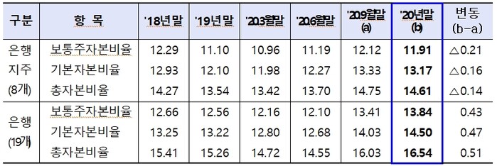 한편 8개 은행지주회사의 12월 말 BIS 총자본비율은 14.61%로 전분기 말보다 0.14%p 내렸다. 주요 자회사인 은행의 대출증가 등 위험가중자산 전분기보다 1.3% 증가한 영향으로 풀이된다.
