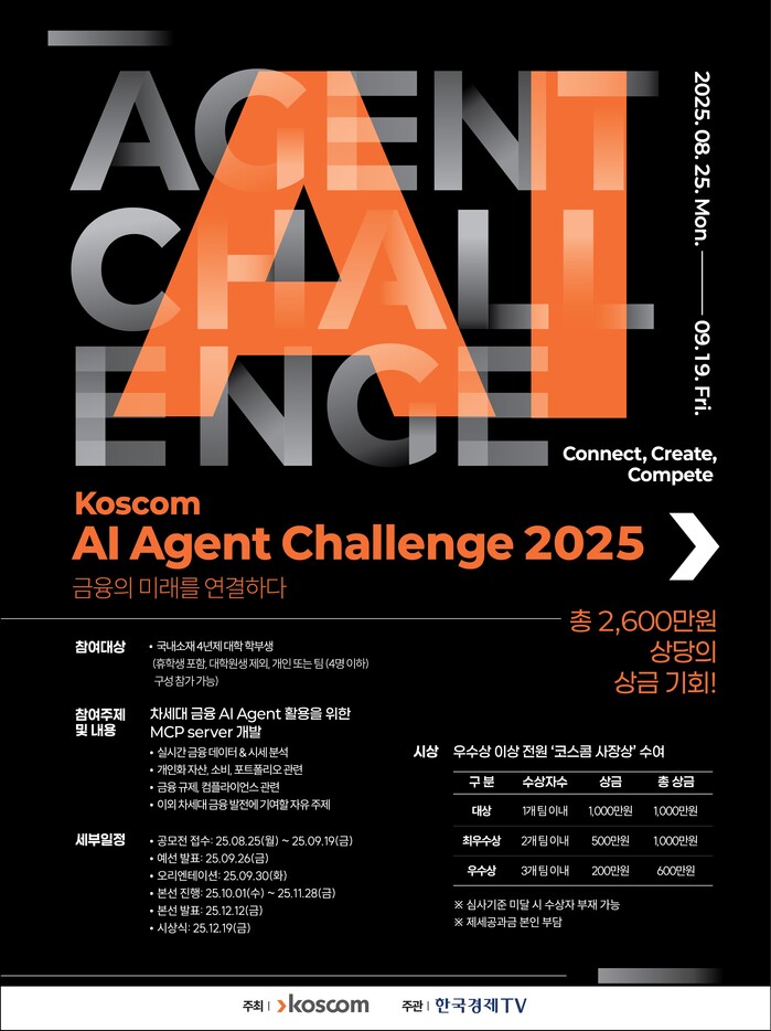 [메가경제=이상원 기자] 코스콤은 지난 9월 19일에 접수 마감된 ‘KOSCOM AI Agent Challenge 2025’ 예선 심사 결과, 전국 32개 대학에서 총 71개팀이 참여해 그 중 10개팀이 본선 프로젝트 대상팀으로 선정됐다고 1일 밝혔다.
