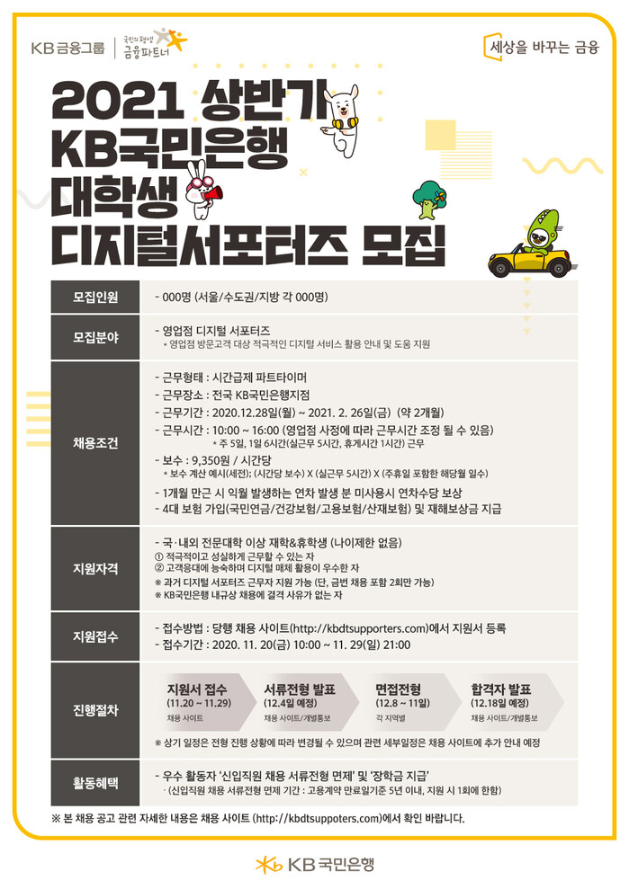 [메가경제=최낙형 기자] KB국민은행은 이달 20일부터 29일까지 2021년 상반기 대학생 ‘디지털 서포터즈’를 모집한다고 밝혔다.
