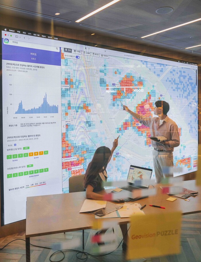 지오비전 퍼즐은 주요 지역 실시간 혼잡도를 한눈에 볼 수 있는 ‘지도 뷰’와 기지국 기반 위치 데이터를 활용한 ‘데이터 카탈로그’로 구성돼 있다.