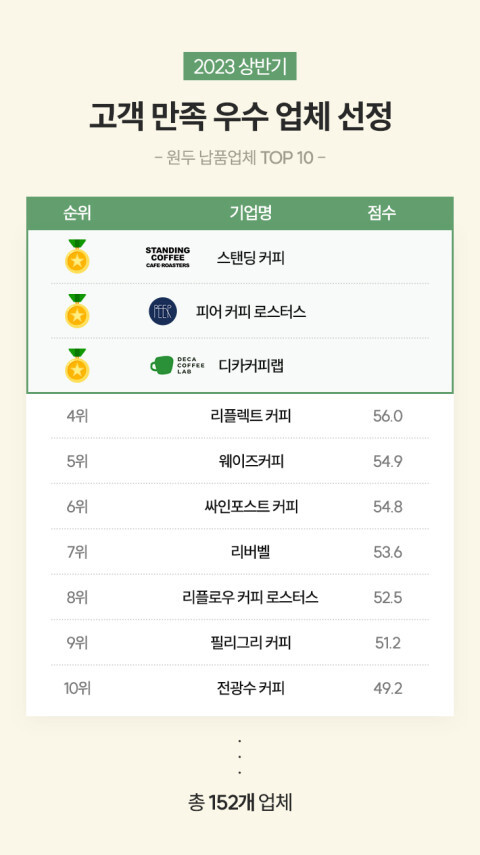 코케비즈의 분석 결과, 상반기 고객 만족 우수 업체로 선정된 ‘피어 커피’, ‘스탠딩 커피’, ‘디카커피랩’은 개인 카페 점주가 선호하는 대중적인 가격과 맛의 원두를 공급하고 있으며, 거래처 관리에 세심한 주의를 기울인다는 점이 공통된 특징으로 나타났다.