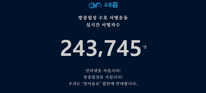 12일 기준 온라인으로 진행 중인 ‘망 무임승차 방지법(망 사용료 법)’에 반대하는 서명 운동에는 총 24만 3000명이 넘은 인원이 참여한 상태다. 해당 서명 운동은 사단법인 오픈넷에 의해 운영‧공개되고 있으며 시작한 지 약 한 달 만에 24만 명을 넘긴 것이다.