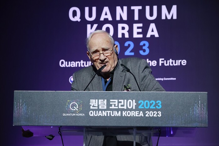 ▲ 지난해 노벨물리학상을 수상한 존 클라우저 박사가 지난 6월 26일 오후 서울 중구 동대문디자인플라자(DDP)에서 열린 국내 최대 양자 기술 관련 국제행사 '퀀텀 코리아 2023' 개막식에서 축사를 하고 있다. [서울=연합뉴스] |