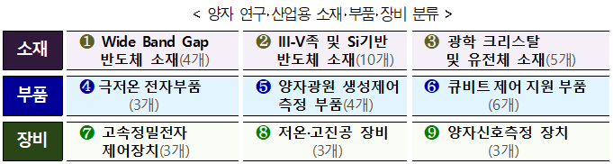 ▲ 양자 연구‧산업용 소재‧부품‧장비 분류. [과기정통부 제공] |