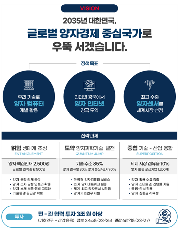 정부는 또 이번 전략에서 2035년 글로벌 양자경제 중심국가가 되기 위해 우리 기술로 양자컴퓨터를 개발‧활용하고, 인터넷 강국에 이어 양자 인터넷 강국으로 나아가며, 세계 최고 수준의 양자센서로 세계 시장을 선점하고, 국방‧첨단산업과 융합해 양자경제 시대를 열어나간다는 목표를 제시했다.