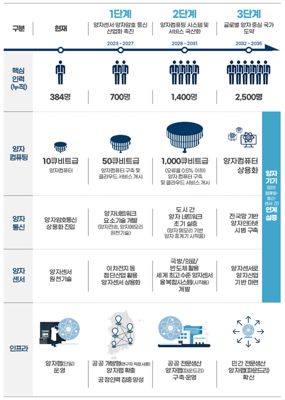 정부는 글로벌 양자경제 중심국가 진입을 위해 우선 기술수준이 상대적으로 높은 양자센서‧양자암호통신의 산업화를 촉진하고, 2031년까지 양자컴퓨팅 시스템과 서비스를 개발하기로 했다.