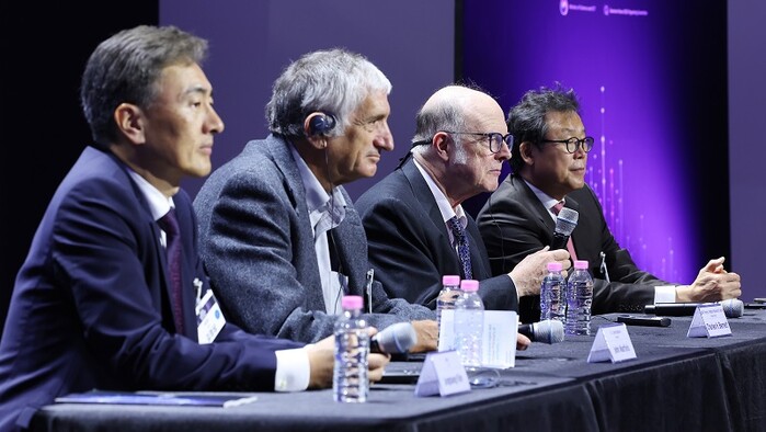 ▲ 지난 6월 27일 오후 2023 퀀텀 코리아 행사가 열리고 있는 서울 동대문디자인플라자 아트홀에서 양자과학기술 석학들이 기자간담회를 하고 있다. 왼쪽부터 김정상 미국 듀크대 교수 겸 아이온큐 CTO, 존 마르티니스 미국 UC샌타바바라 대학 교수, 찰스 베넷 IBM연구소 연구위원, 김명식 영국 임페리얼대 교수. [서울=연합뉴스] |