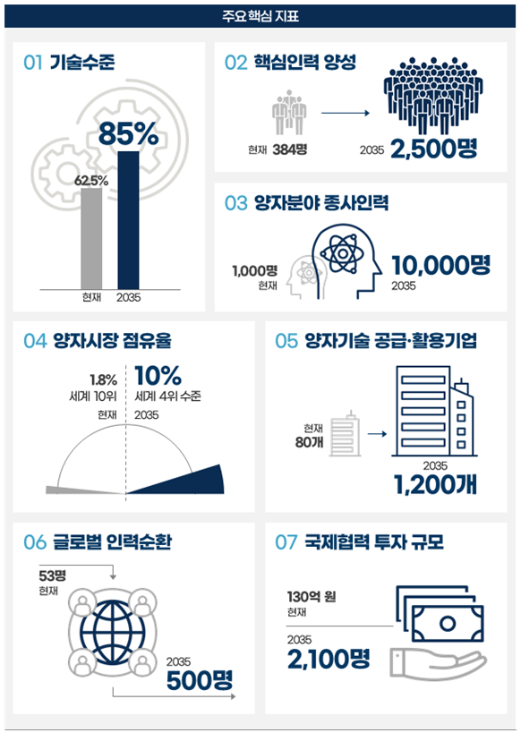 이를 위해 정부는 2035년까지 우리나라 양자과학기술 수준을 최선도국 대비 85%로 높이고, 양자핵심인력은 2500명까지 양성해 나가기로 했다.