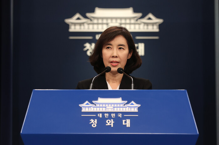 ▲ 박경미 청와대 대변인이 27일 청와대 춘추관 대브리핑룸에서 문재인 대통령의 노태우 전 대통령 추모 메시지 등과 관련한 브리핑하고 있다. [사진=연합뉴스] |