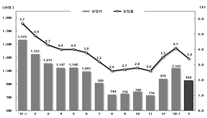 실업자수는 95만4천명으로 1년 전보다 39만9천명 줄었고 실업률은 3.4%로 1.5%포인트 하락했다. 집계 기준을 변경한 1999년 6월 이후 2월 기준 역대 최저치를 나타냈다.