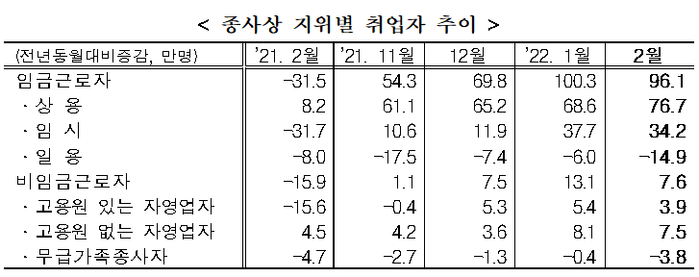 임금근로자 중에서는 상용근로자(76만7천명)와 임시근로자(34만2천명)는 증가했으나 일용근로자(-14만9천명)는 감소했다.