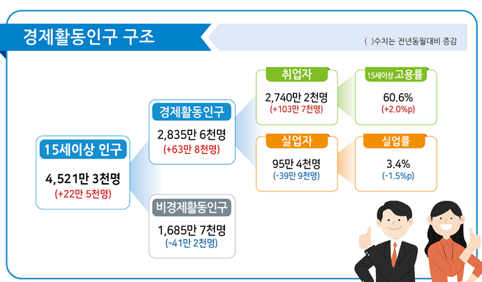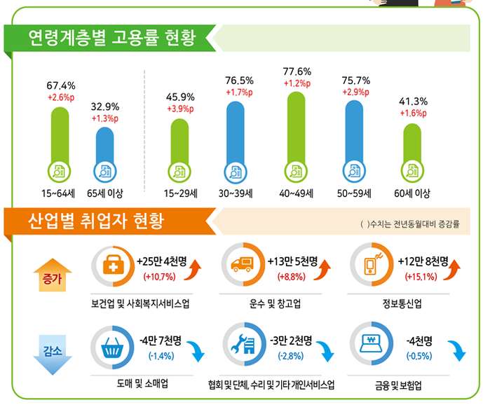 실업자는 20대(-12만 2천명), 50대(-11만명), 30대(-7만 6천명) 등에서 감소했고, 실업률은 20대(-3.3%p), 50대(-1.8%p), 60세이상(-1.5%p) 등 모든 연령층에서 떨어졌다.
