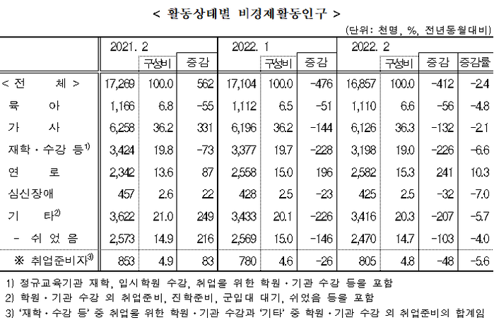 비경제활동인구를 활동상태별로 보면 ‘재학·수강 등’에서 22만6천명이 줄었고 ‘가사’에서도 13만2천명이 감소했다.