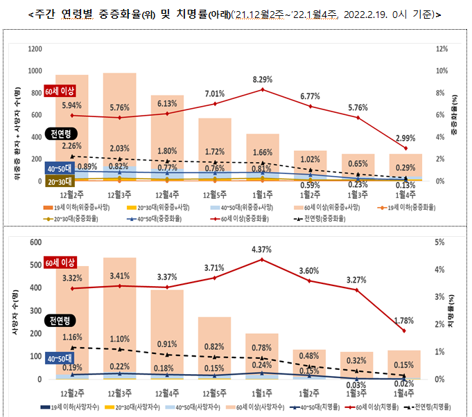 전연령 주간 중증화율은 12월 2주 2.26%에서 1월 4주에는 0.29%로 8분의 1 수준으로 낮아졌고, 전연령 사망자수는 12월 2주 1.16%에서 1월 4주 0.15%로 역시 8분의 1 수준으로 크게 떨어졌다.