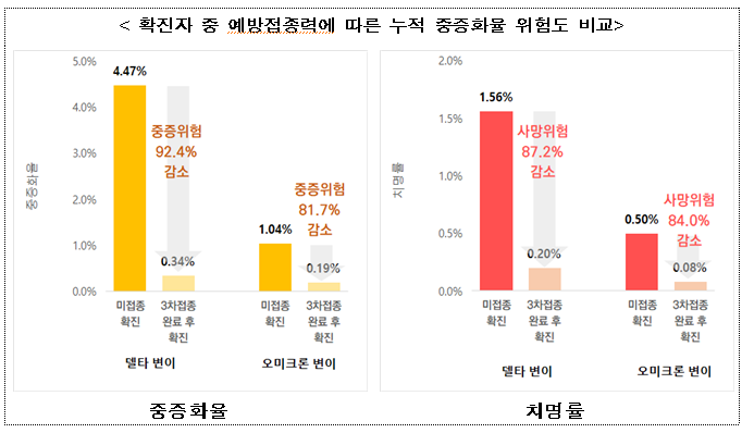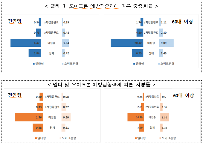 ▲ 델타 및 오미크론 백신 예방접종력에 따른 중증화율과 치명률. [중앙재난안전대책 본부]