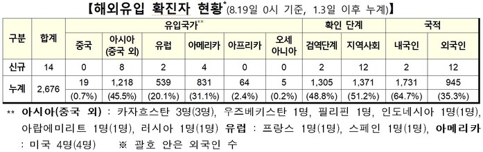 이들은 검역단계에서 2명이 확인되었고, 입국 후 지역사회에서 자가격리 중 12명이 확진됐다. 이중 내국인이 2명, 외국인은 12명이다.