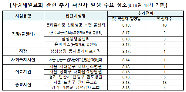 ▲ 18일 오후 6시 기준 사랑제일교회 관련 추가 확진자 발생 주요 장소. [출처= 중앙방역대책본부] |
