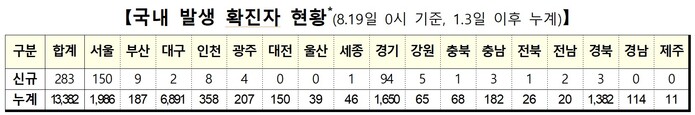 이날 국내발생자 283명을 지역별로 보면, 서울 150명을 비롯 경기 94명, 인천 8명으로 수도권에서만 252명의 확진자가 나타났다. 이어 부산 9명, 강원 5명, 광주 4명, 충남·경북 3명, 전남·대구 2명, 세종·충북·전북 1명 순이다.