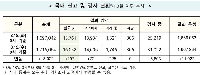 중앙방역대책본부(방대본)는 19일 0시 기준, 전날 대비 코로나19 신규 확진자가 297명이나 급증하며, 총 누적확진자 수는 1만6058명이라고 밝혔다.