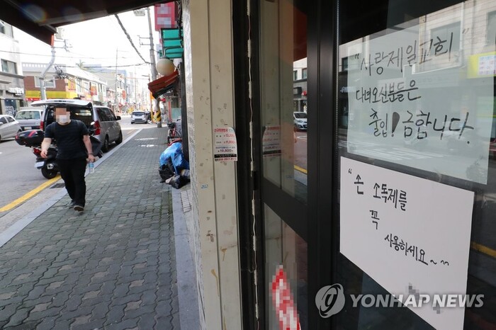 ▲ 19일 오전 서울 성북구 장위10주택재개발단지 인근 식당에 사랑제일교회 방문자들의 이용 자제 안내문이 붙어 있다. [서울= 연합뉴스] |