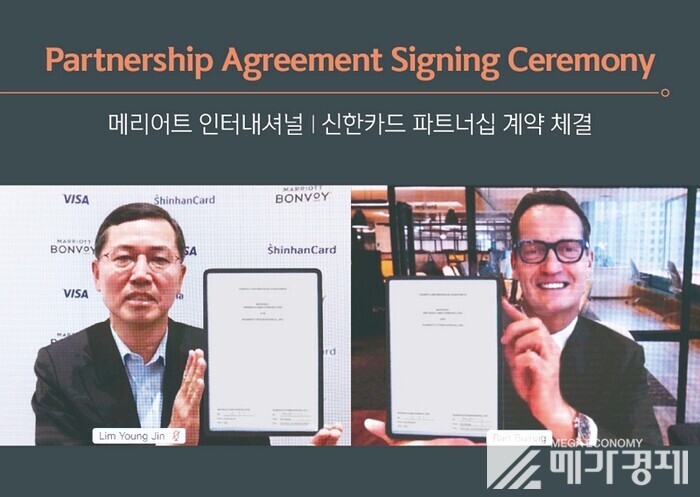 ▲ '메리어트 본보이TM 더 베스트 신한카드' 출시를 기념해 지난 23일 서울 을지로 신한카드 본사에서 비대면 사이닝 세리모니를 진행, 임영진 신한카드 사장(왼쪽)과 바트 뷰링 메리어트 인터내셔널 아시아 태평양지역 세일즈 앤 마케팅 최고 책임자가 파트너십 계약서를 들고 있다. [사진=신한카드 제공] |